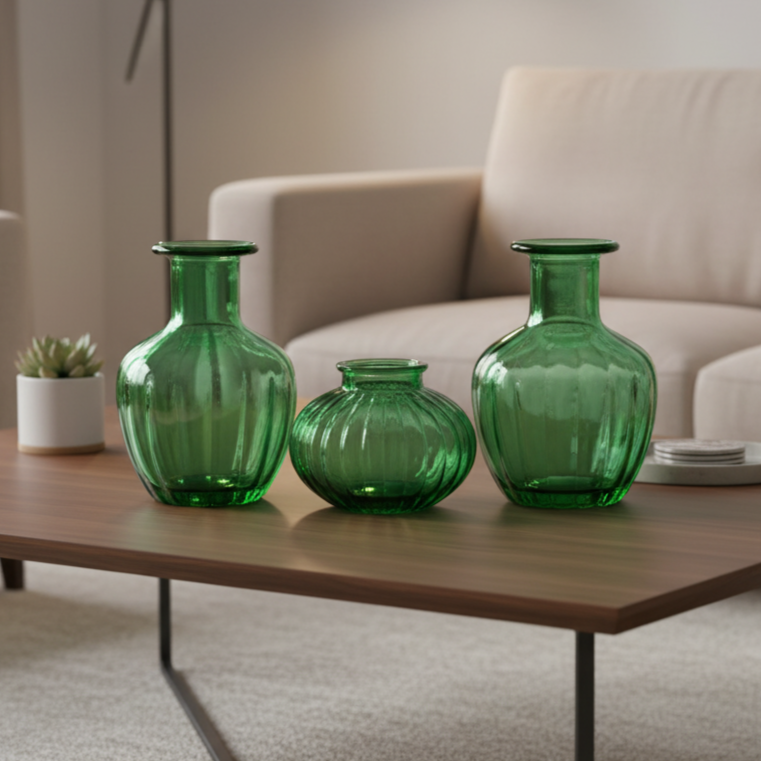 Be the first to review “3-Piece Emerald Green Ribbed Glass Vase Set for Home & Office Decor” Cancel reply