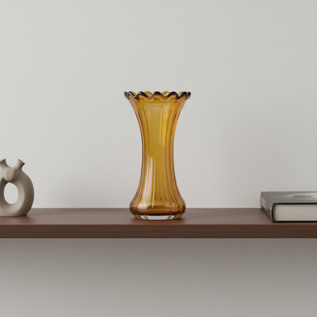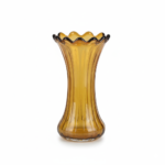 Add a touch of warm, vintage charm to your home with this beautiful Amber Yellow glass vase. It features a graceful fluted shape with a subtle ribbed texture running vertically up the body. The top is finished with a unique, eye-catching scalloped or ruffled rim.