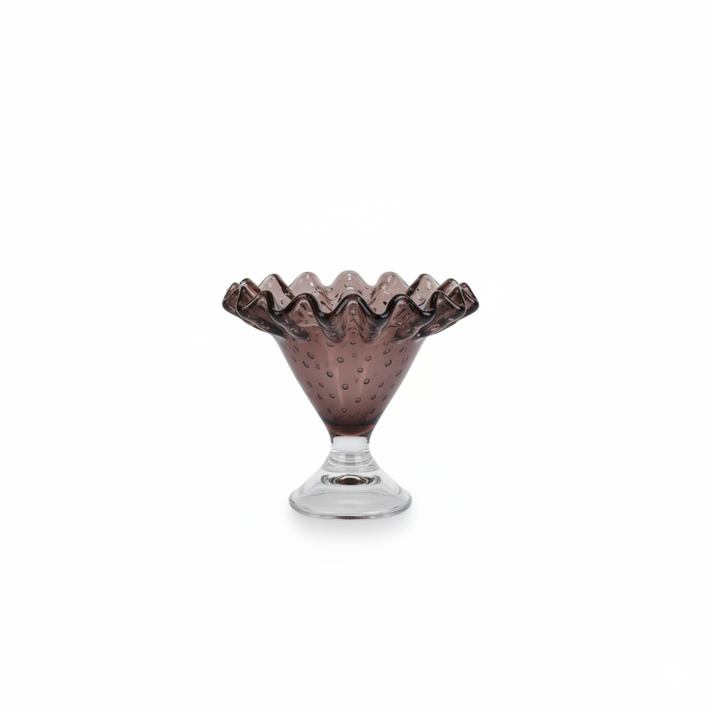Elevate your table setting with this exquisite Elegant Ruffle Glass Pedestal Bowl. It features a classic pedestal base and a distinctive ruffled, wavy top edge in a subtle smoky mauve/brown color, adding a high-end vintage touch to your decor.