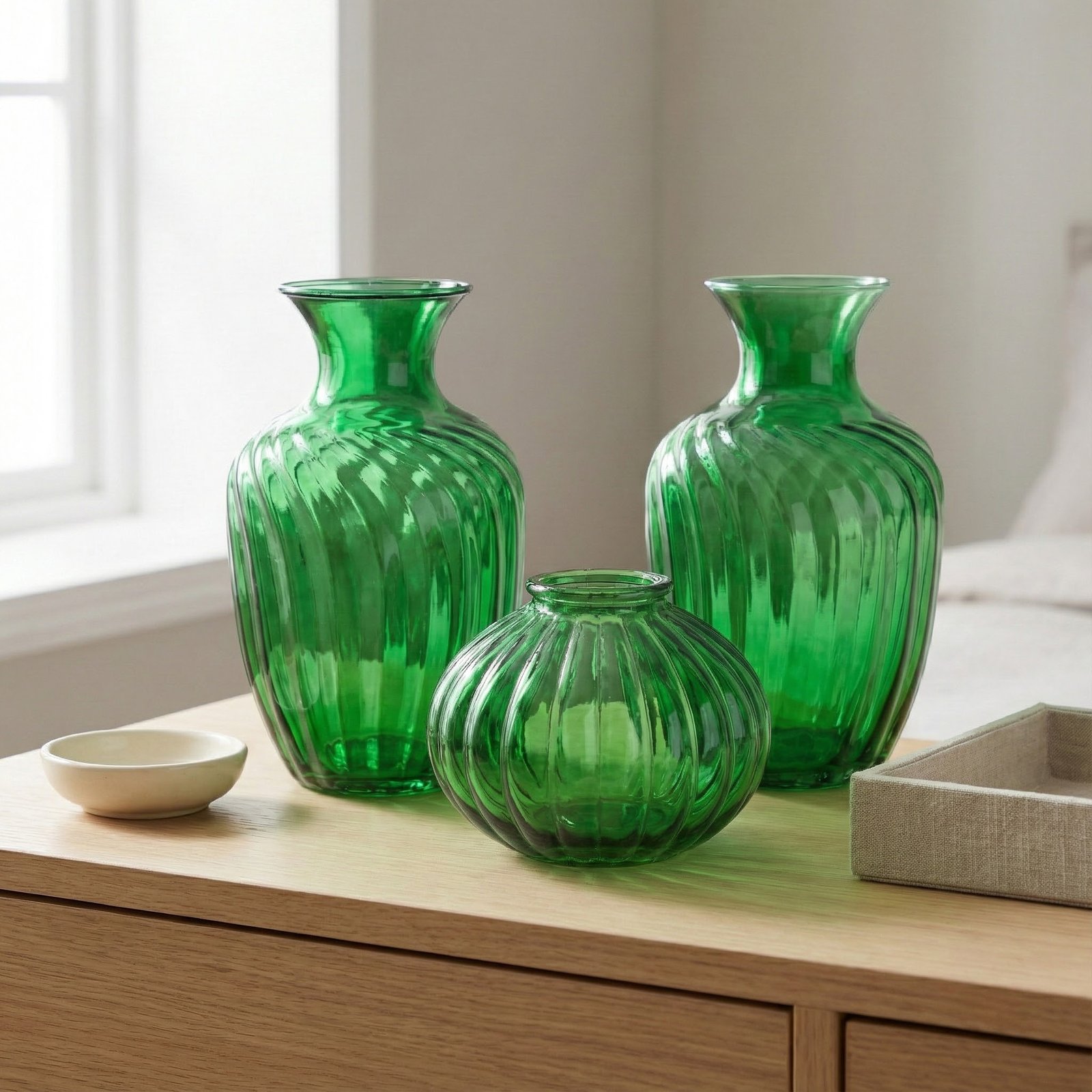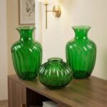 Create a perfectly balanced and luxurious look in your drawing room with this 3-piece Emerald Green Vase Set. Unlike standard sets, this collection features two identical tall vases to frame your space, along with a matching round squat vase for the center.