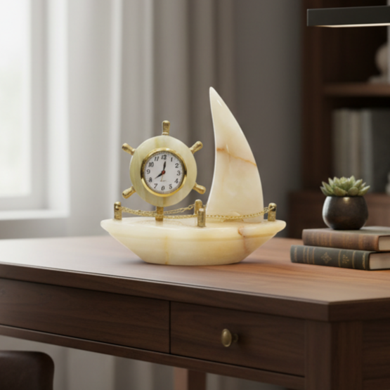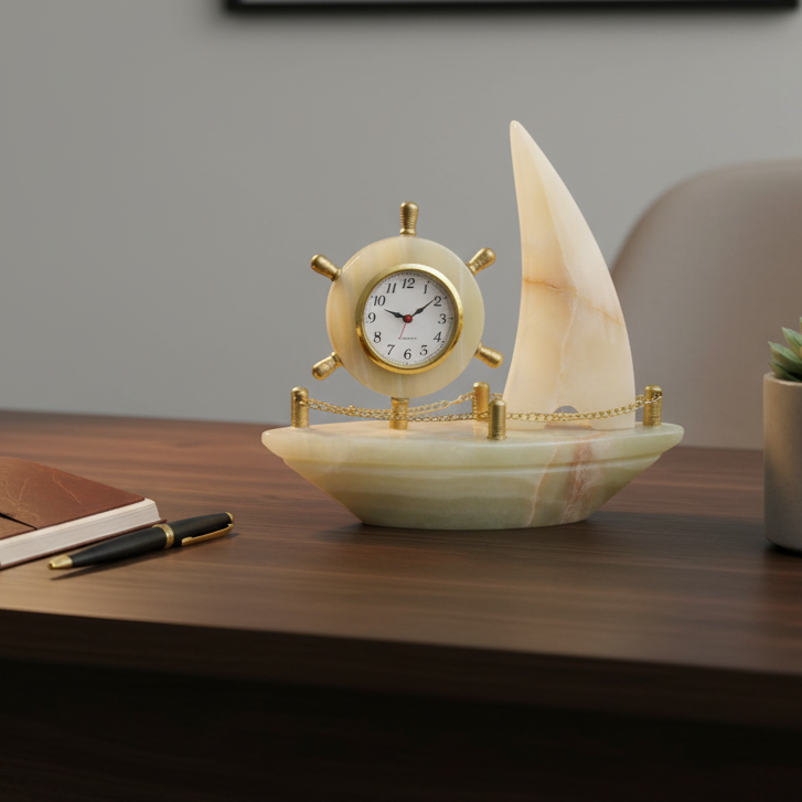 Introducing this magnificent Hand-Carved Onyx Sailboat Desk Clock. Crafted from polished, natural Onyx stone, this unique piece features striking beige and green veining in the hull and sail. The clock face is set within a steering wheel design with elegant brass accents, giving it a maritime aur high-end look.