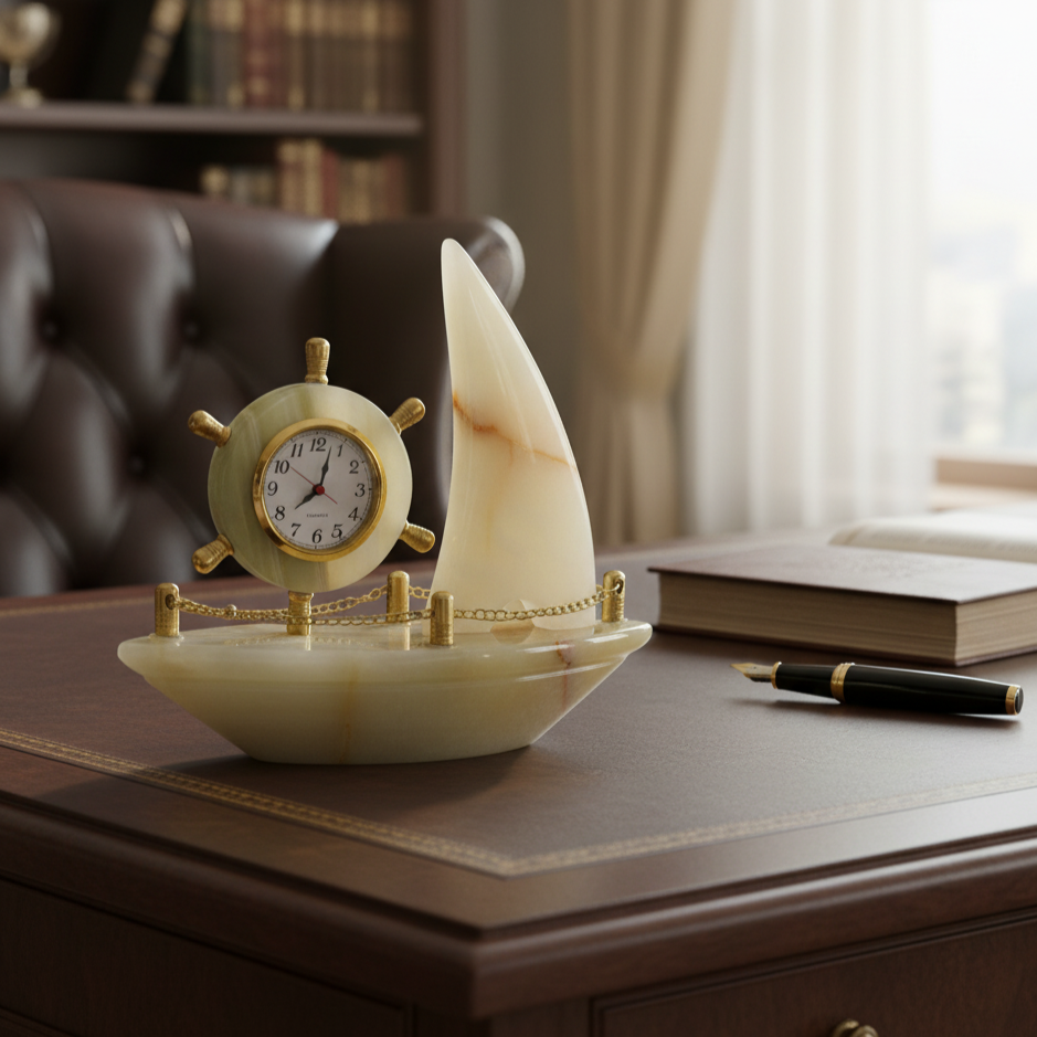 Hand-Carved Onyx Sailboat Desk Clock – Premium Office & Home Decor