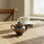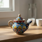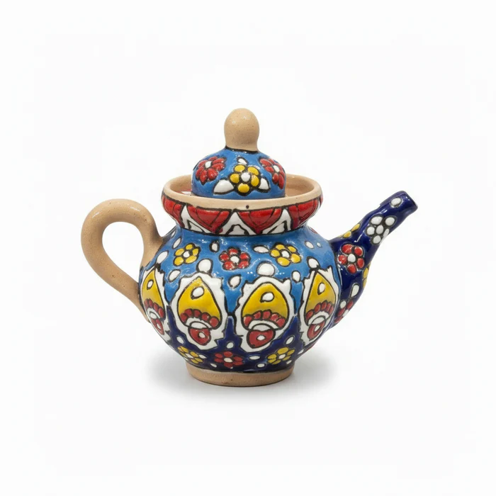 This handcrafted ceramic teapot combines traditional charm with folk-art vibrance. Featuring a stout, rounded body, a short spout, a simple C-shaped handle, and a removable lid with a small knob, it captures the essence of rustic, handcrafted beauty.