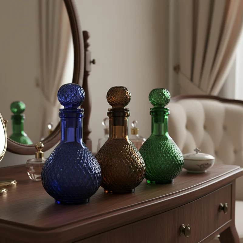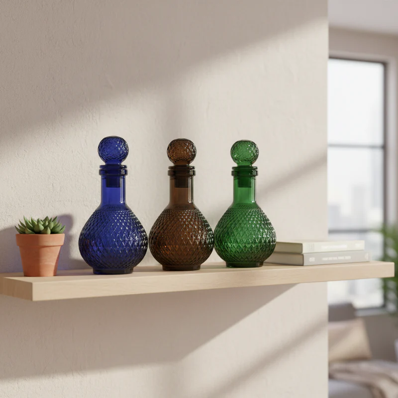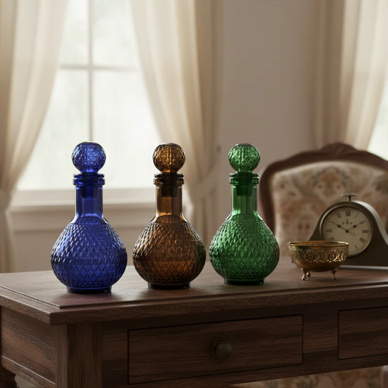 a stunning Set of 3 Colored Glass Decanters, perfect for elevating your home décor, dining table, or personal vanity.