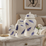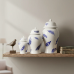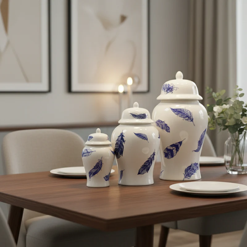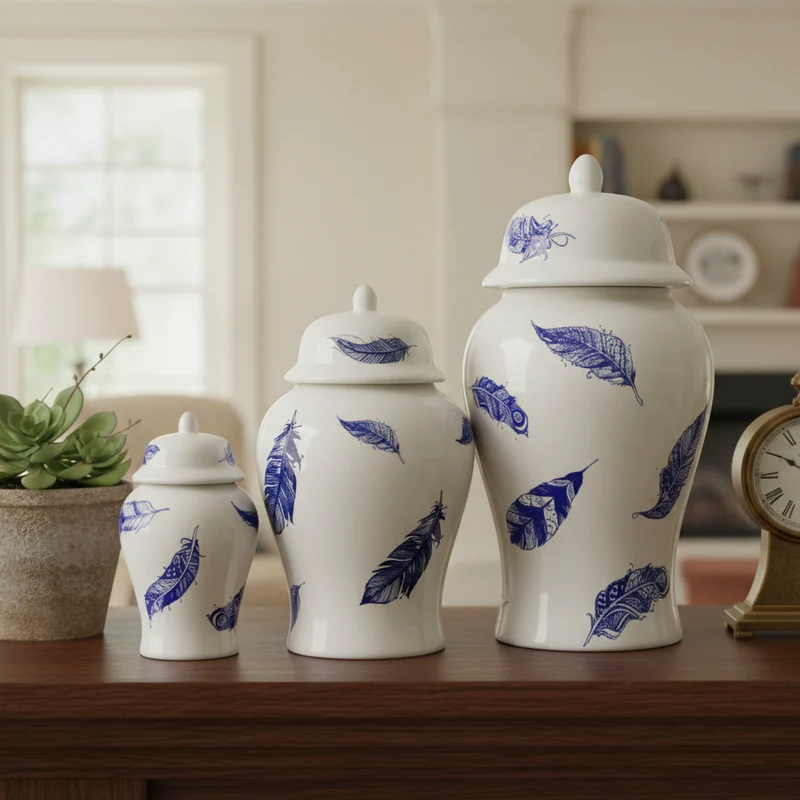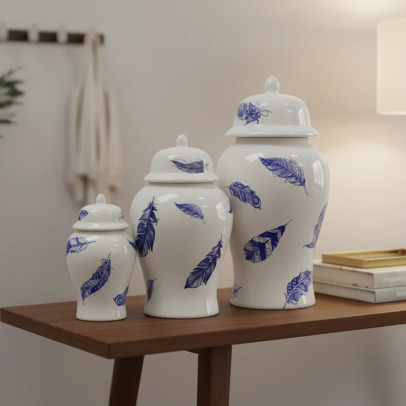 Each traditional jar, featuring the distinctive lidded silhouette and graduated sizes, is crafted from smooth white ceramic. Instead of the classic floral or landscape motifs, these jars are adorned with a charming, scattered print of deep blue feather designs.